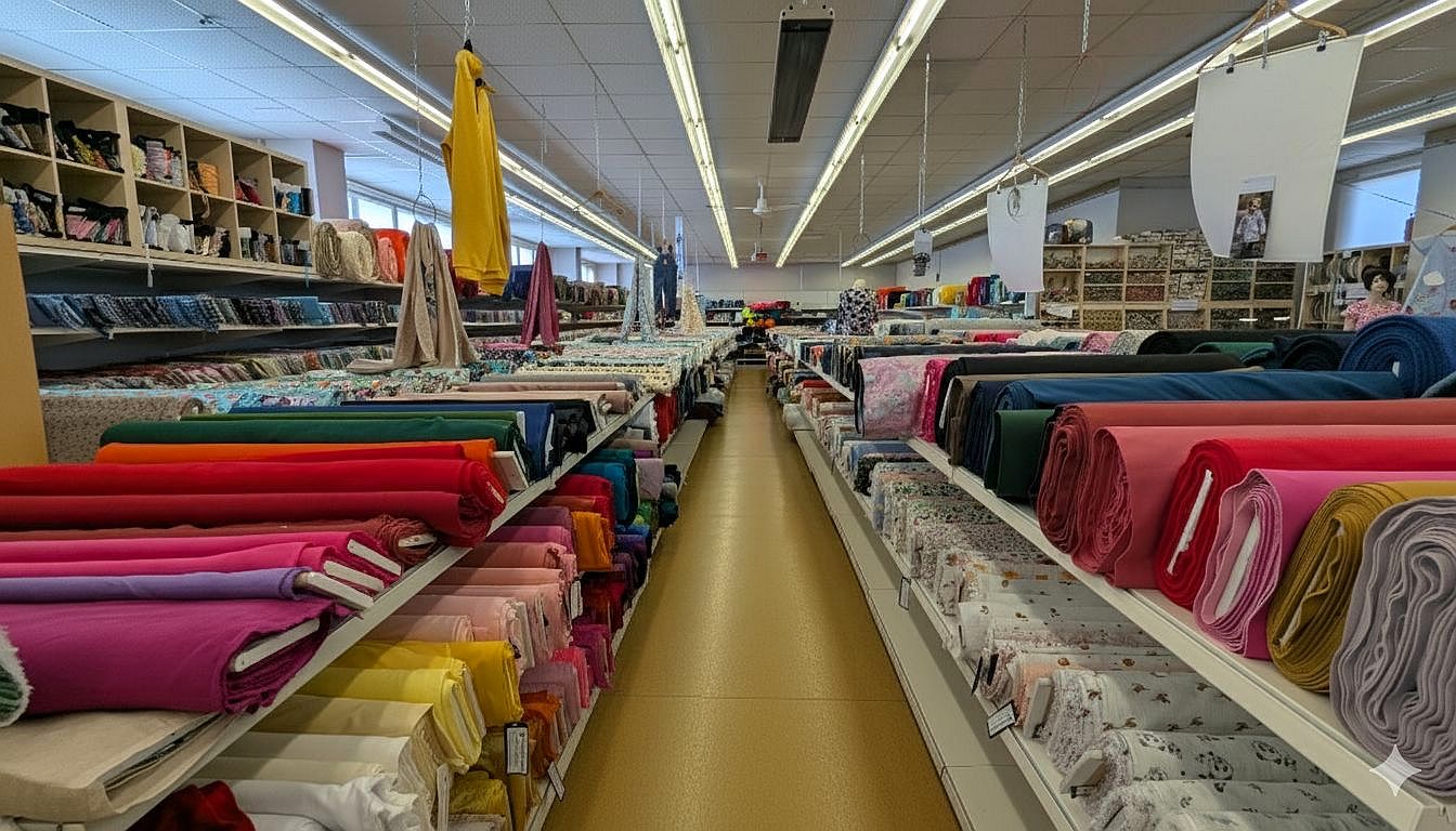 Klicken Sie auf 'Mehr dazu', können Sie einen virtuellen Rundgang durch das Outlet der schönen Stoffe beginnen.