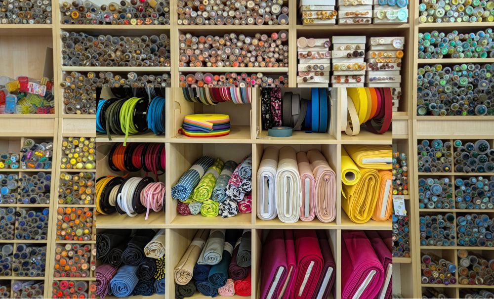 Eine große Auswahl an Knöpfen, Bändern, Kordeln, Borten, Spitzen, Reißverschlüssen, Endlosreißverschlüssen und vielem mehr, was man zum Nähen braucht, finden Sie natürlich auch bei uns.